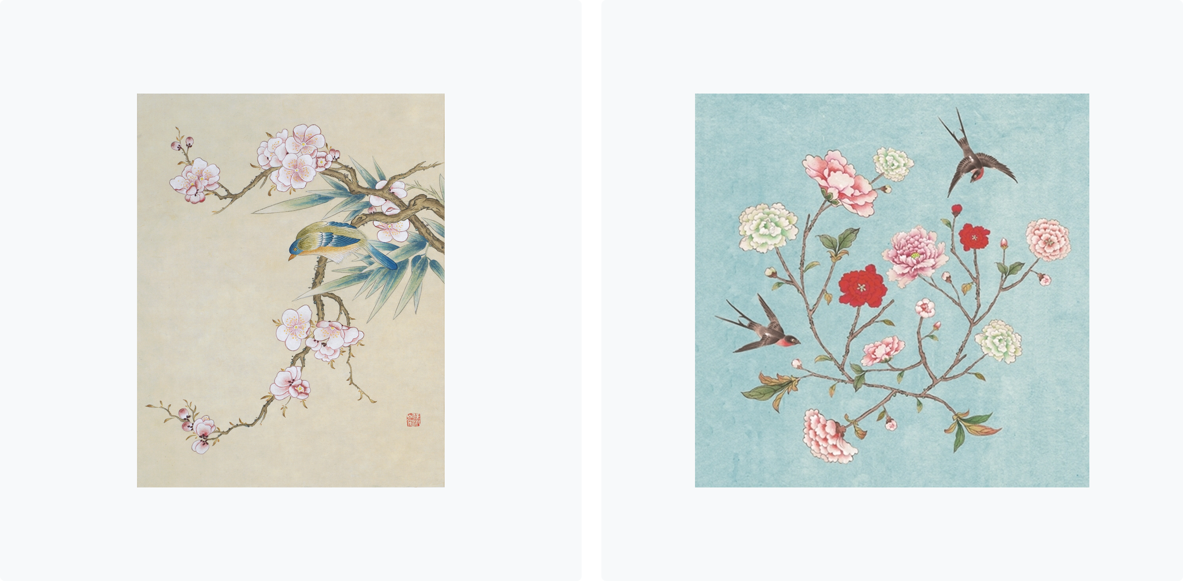 왼쪽부터 신사임당 (화조도 12폭 매화 대나무 새), WHHACHHO 화조도 파랑 (스타트업 협찬그림)