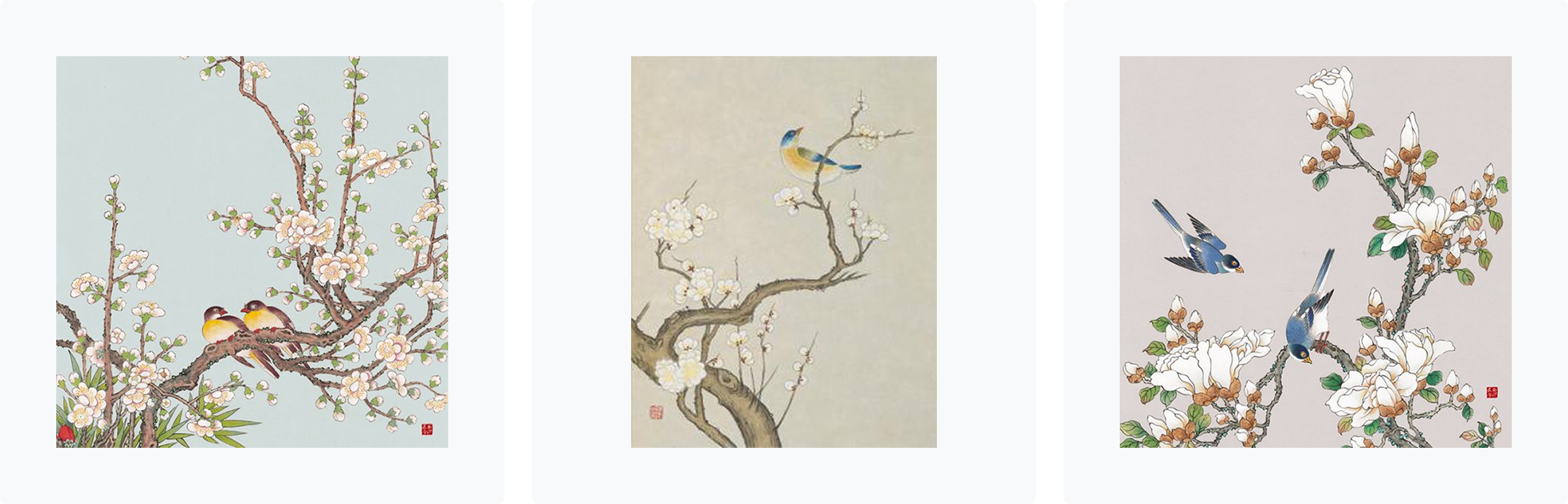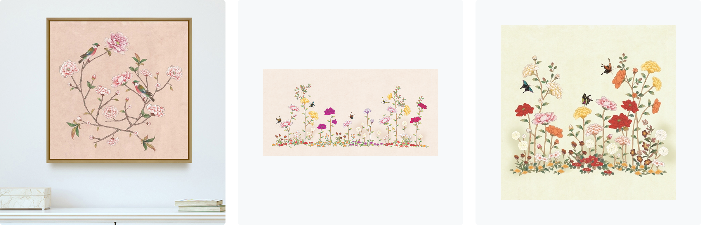 왼쪽부터 화조도 S5, 신사임당 (화조도 12폭 매화와 새), 화조도 S3