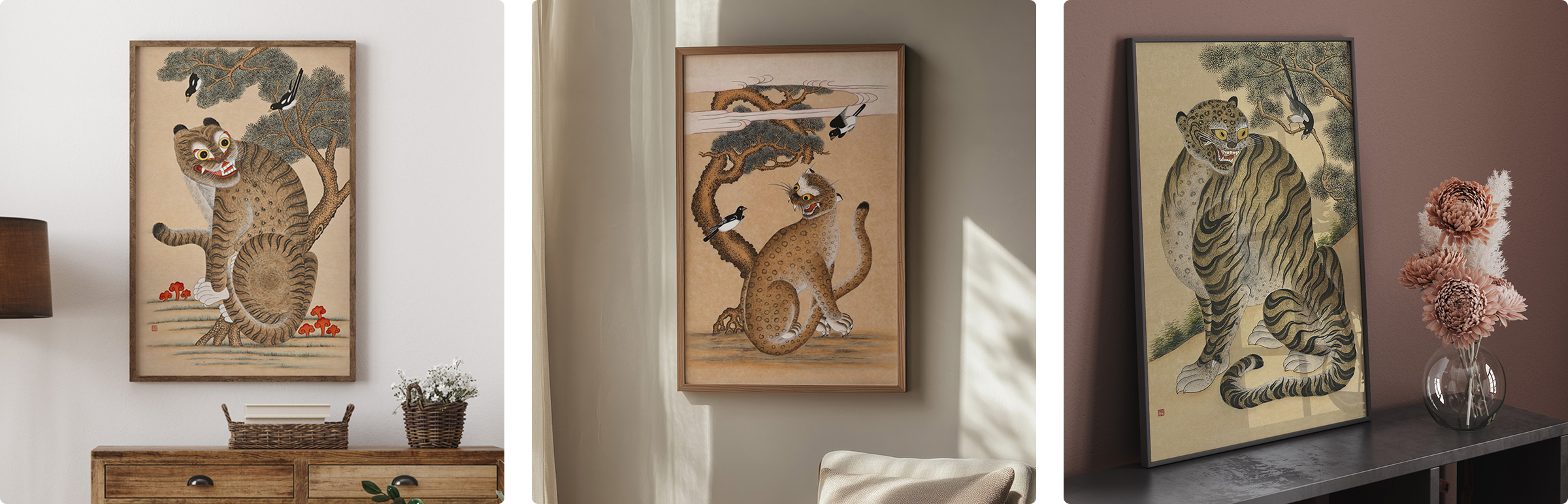 왼쪽부터 호작도 (까치와 호랑이), 호작도 (까치와 호랑이) Ⅱ, 호작도 (까치와 호랑이) Ⅲ