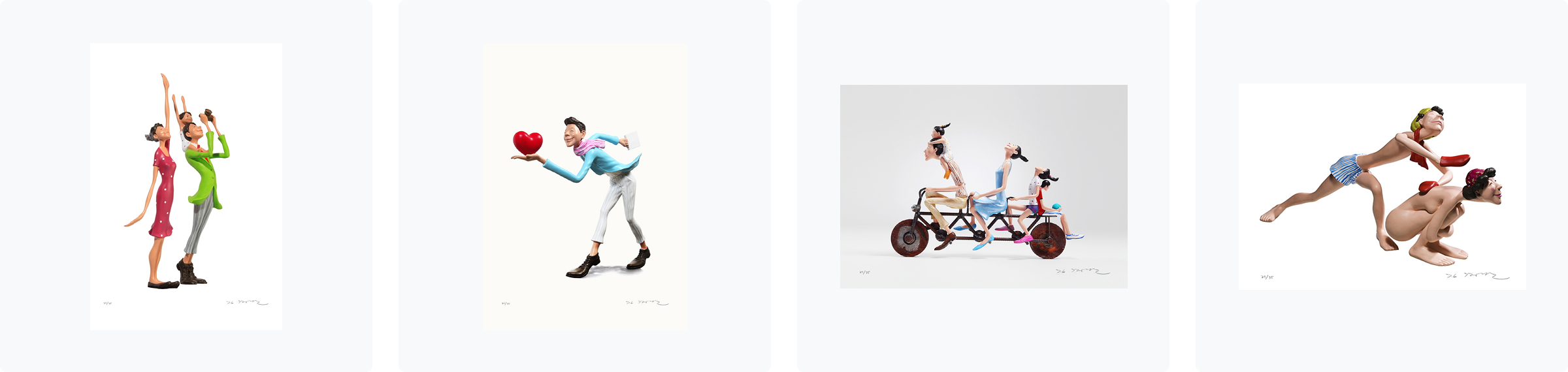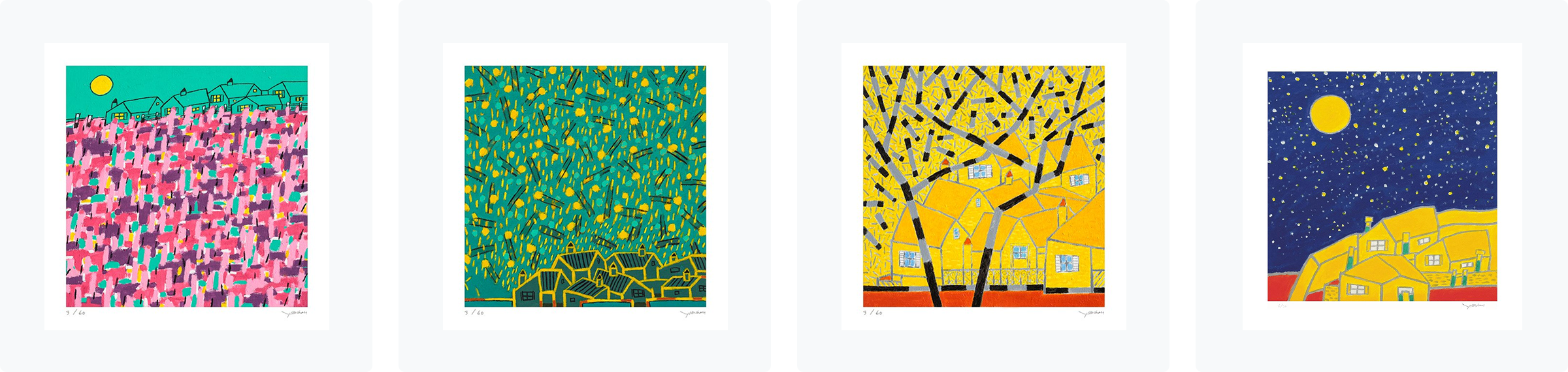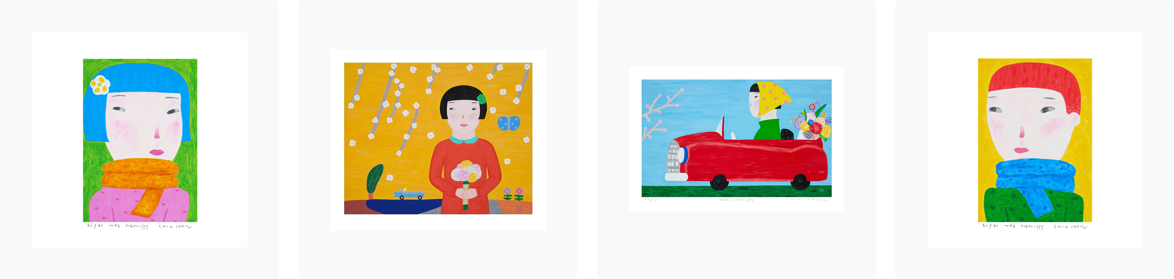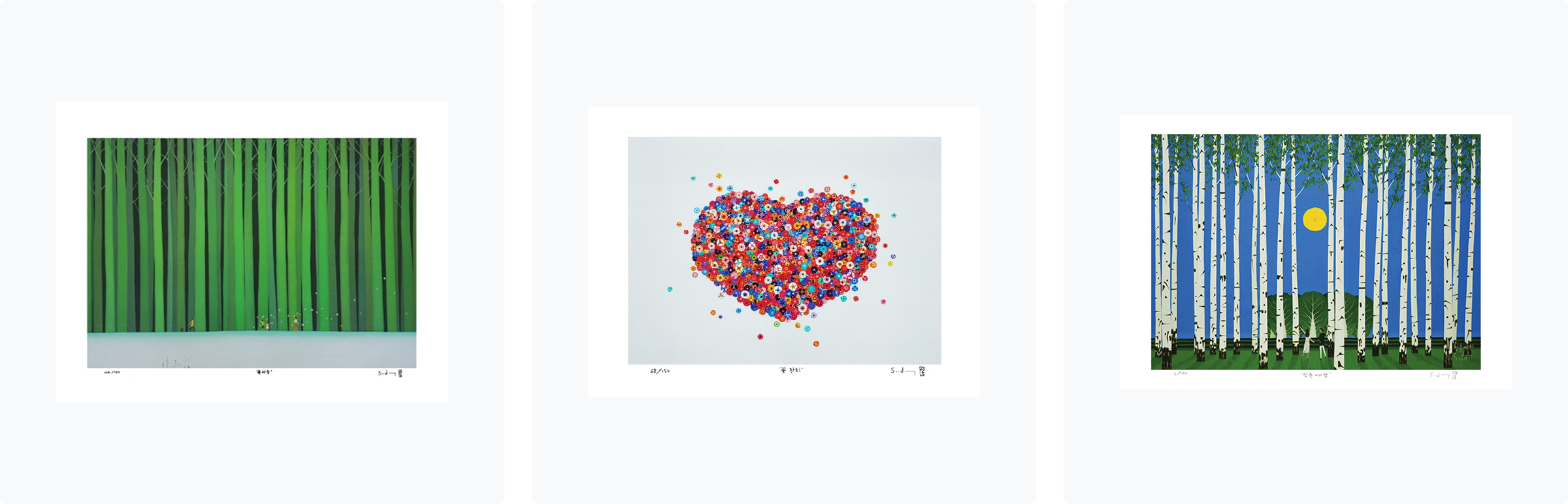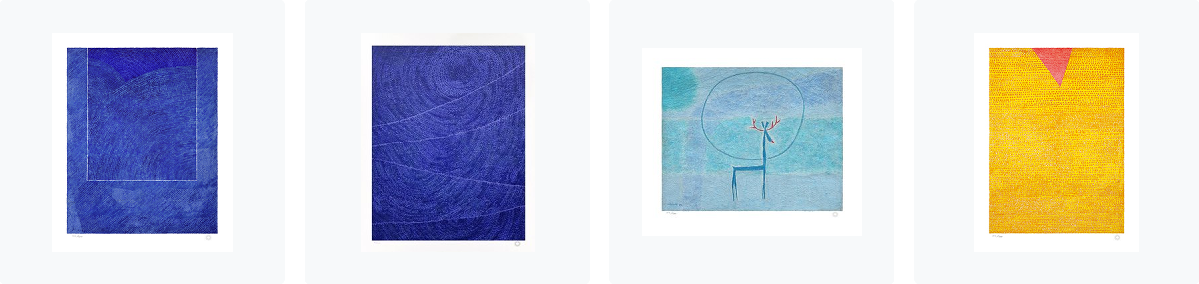 왼쪽부터 산울림 19-II-73 #307 (500 Editions), Air and Sound(Ⅱ)10-Ⅹ-73 #322 (200 Editions), 사슴 1958 (500 Editions), 저녁노을 14-XII-71 #217 (500 Editions)