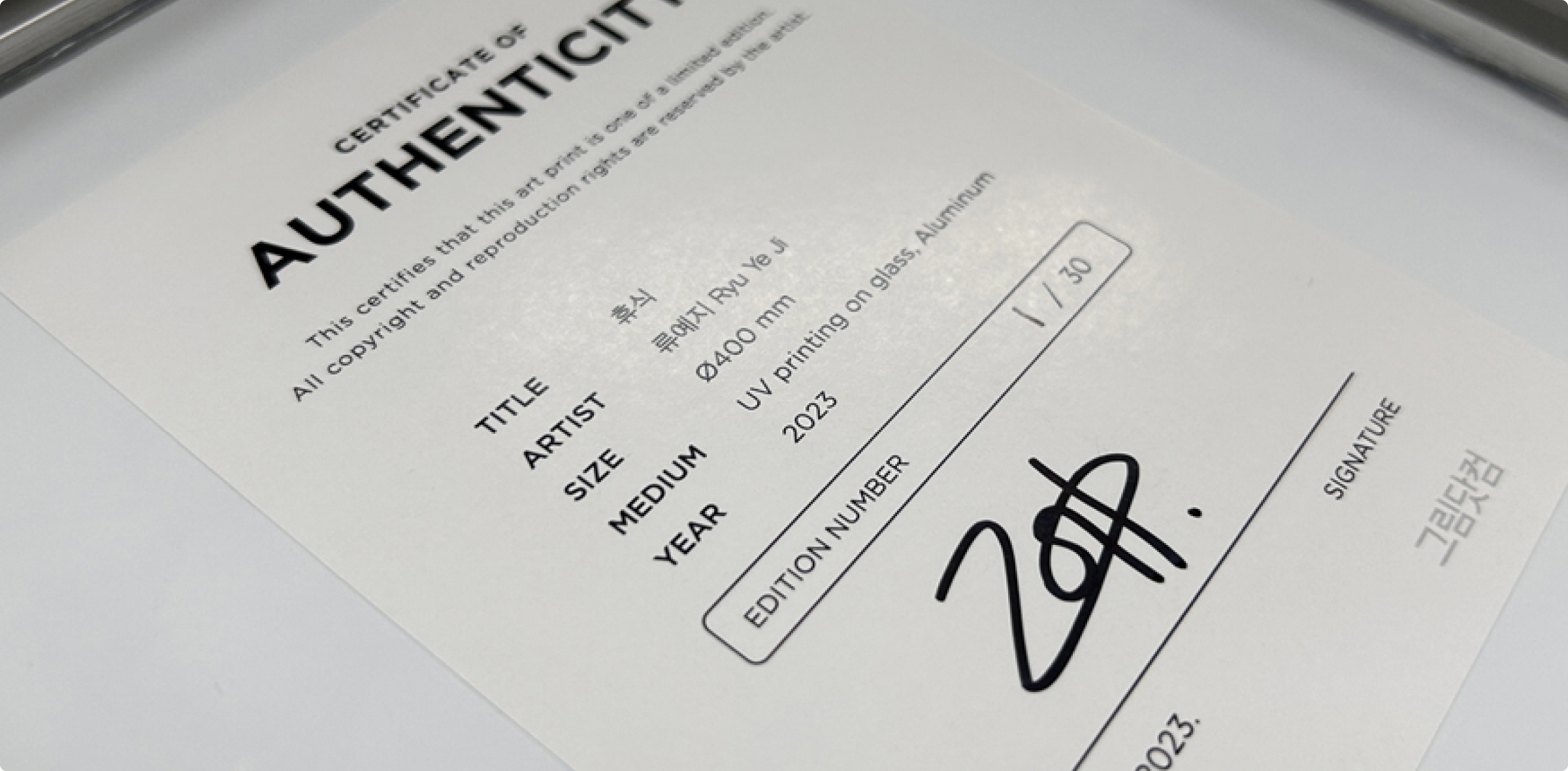 에디션 Editions 아트 미러는 한정판으로 제작되어 고유 넘버, 작가 친필사인이 기재된 보증스티커가 작품 후면에 부착됩니다.