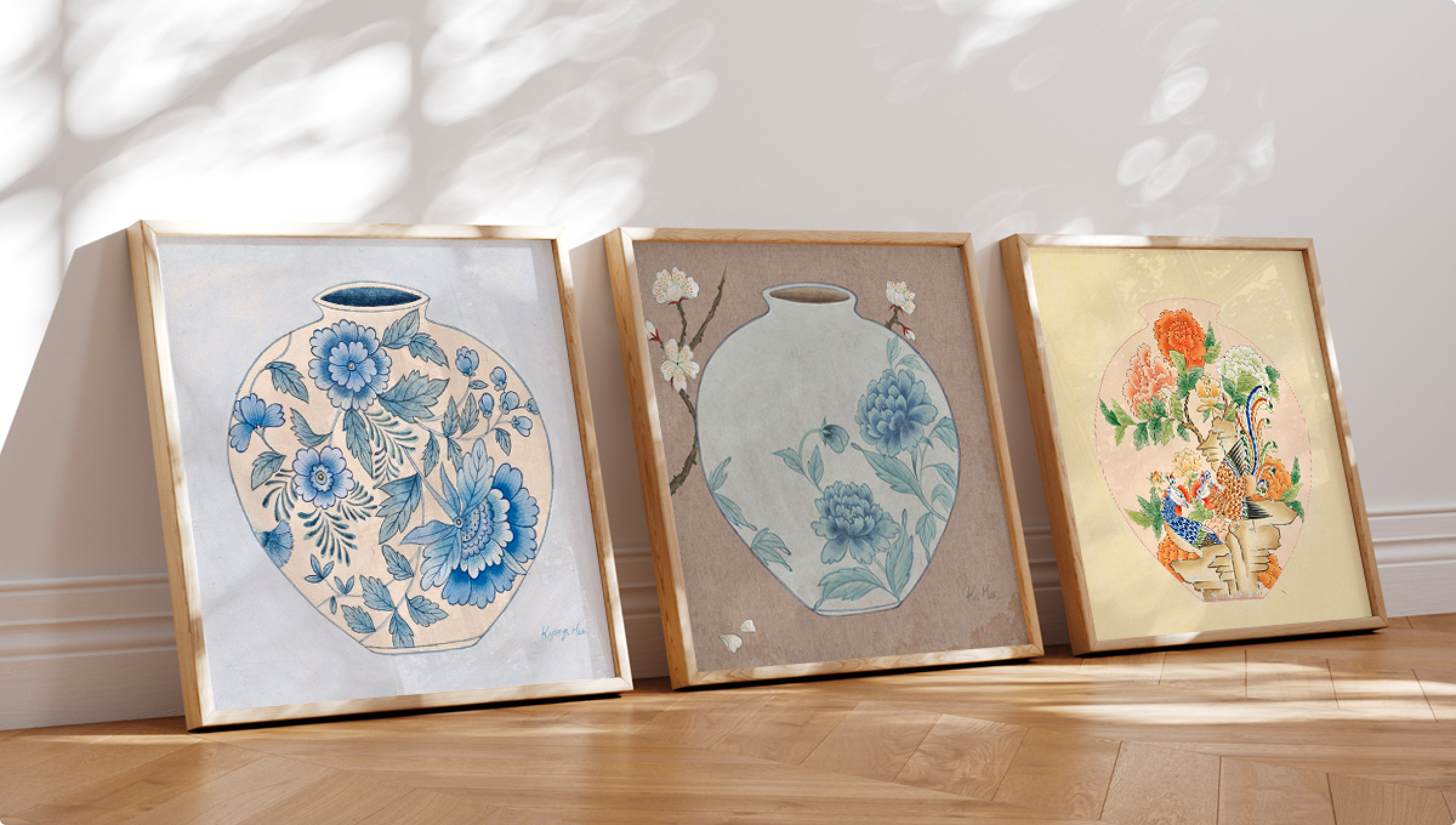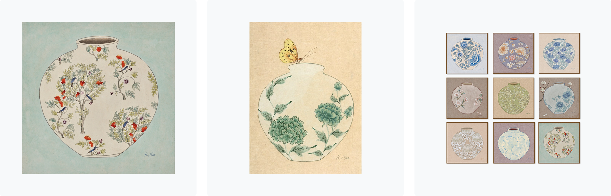 왼쪽부터 달항아리-정원 Ⅲ, 달항아리_꽃을담다 Ⅱ, [액자포함] 달항아리 9종 세트