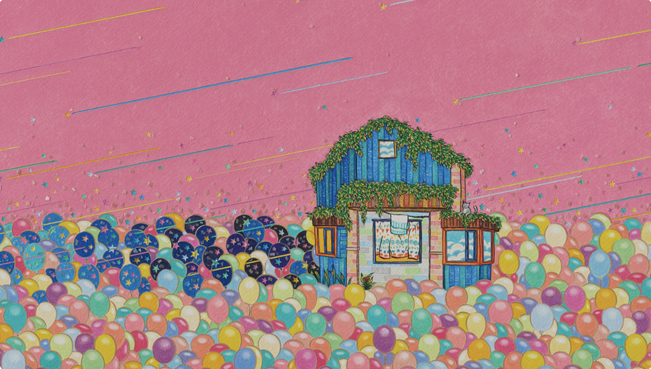 아련한 향수가 느껴집니다. 반짝이는 별과 풍선, 밝은 색감으로 채워진